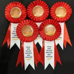 Hoa cài áo được làm từ hoa vải lụa cao cấp, màu sắc tươi tắn, form dáng bền đẹp, không bị nhàu nát trong suốt thời gian sự kiện. Mặt huy hiệu được dập giấy in logo bằng máy dập giấy chuyên dụng trên nền mặt nhôm, đảm bảo màu sắc logo rõ nét, chống thấm nước, không bong tróc. Phần ghim cài chắc chắn, dễ sử dụng và an toàn cho trang phục.