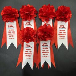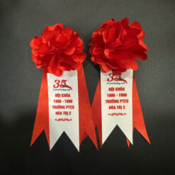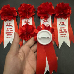 Mẫu hoa cài trong hình được thiết kế với tông màu đỏ nổi bật. Hoa vải mềm mại kết hợp cùng dải ruy băng in thông tin sự kiện. Phần sau được gắn ghim cài chắc chắn, dễ dàng sử dụng và an toàn cho mọi chất liệu trang phục.
